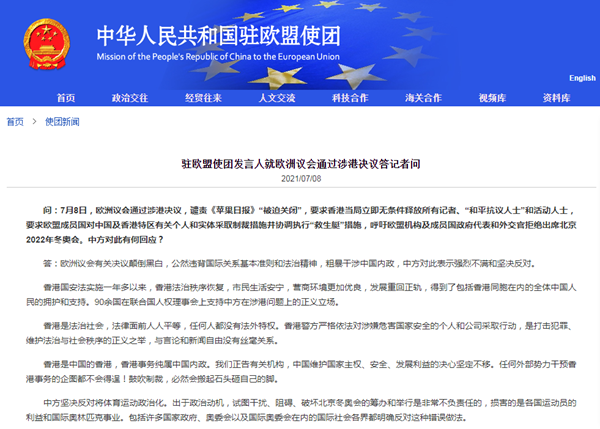 中國(guó)臺(tái)灣網(wǎng)7月9日訊 中國(guó)駐歐盟使團(tuán)發(fā)言人8日就歐洲議會(huì)通過(guò)涉港決議答記者問(wèn)。針對(duì)有記者問(wèn):7月8日,歐洲議會(huì)通過(guò)涉港決議,譴責(zé)《蘋(píng)果日?qǐng)?bào)》“被迫關(guān)閉”,要求香港當(dāng)局立即無(wú)條件釋放所有記者、“和平抗議人士”和活動(dòng)人士,要求歐盟成員國(guó)對(duì)中國(guó)及香港特區(qū)有關(guān)個(gè)人和實(shí)體采取制裁措施并協(xié)調(diào)執(zhí)行“救生艇”措施,呼吁歐盟機(jī)構(gòu)及成員國(guó)政府代表和外交官拒絕出席北京2022年冬奧會(huì)。中方對(duì)此有何回應(yīng)?