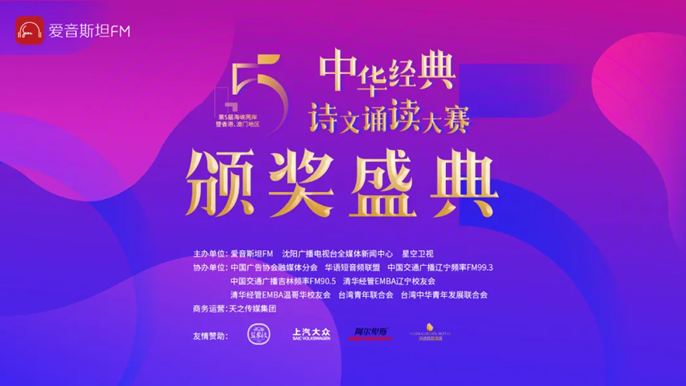 2021第五屆“海峽兩岸暨香港、澳門(mén)地區(qū)中華經(jīng)典詩(shī)文誦讀大賽”,由愛(ài)音斯坦FM聯(lián)合星空衛(wèi)視、沈陽(yáng)廣播電視臺(tái)全媒體新聞中心共同主辦,中國(guó)廣告協(xié)會(huì)融媒體分會(huì)、華語(yǔ)短音頻聯(lián)盟、中國(guó)交通廣播遼寧頻率FM99.3、中國(guó)交通廣播吉林頻率FM90.5、清華經(jīng)管EMBA遼寧校友會(huì)、清華經(jīng)管EMBA溫哥華校友會(huì)、臺(tái)灣青年聯(lián)合會(huì)、臺(tái)灣中華青年發(fā)展聯(lián)合會(huì)協(xié)辦,天之傳媒集團(tuán)獨(dú)家商務(wù)運(yùn)營(yíng)。