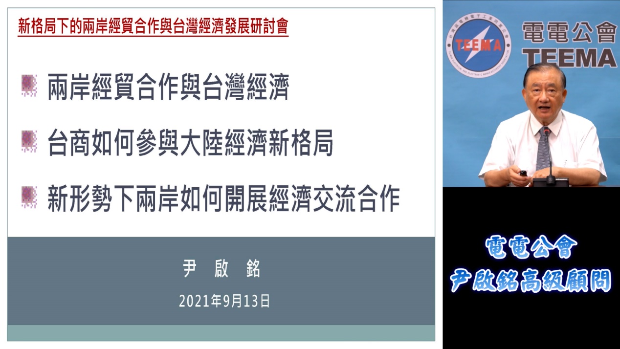 臺灣電機電子同業(yè)公會高級顧問尹啟銘通過視頻連線,參加“新格局下的兩岸經(jīng)貿(mào)合作與臺灣經(jīng)濟發(fā)展研討會”(圖片來源:視頻截圖)