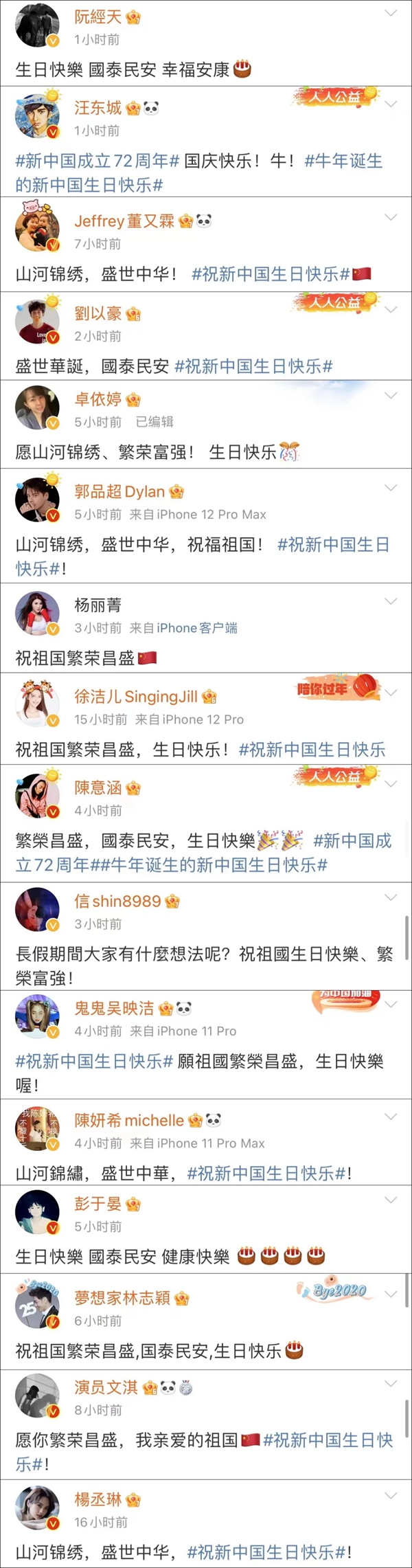 轉(zhuǎn)發(fā)“祝新中國生日快樂”相關(guān)微博的遠不止這幾位臺灣藝人,歐陽娜娜、王大陸、賴冠霖、陳立農(nóng)、焦恩俊、林志穎、楊麗菁、徐潔兒、陳志朋、楊丞琳、陳妍希、阿信、彭于晏、阮經(jīng)天、吳映潔、陳意涵、辰亦儒、汪東城、董又霖、劉以豪、林佑威、卓依婷、文淇等也表達了自己的心聲,綠媒怕是快要酸不過來了……
