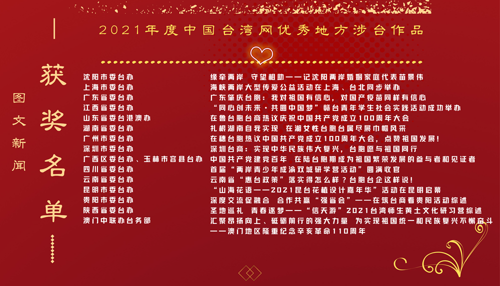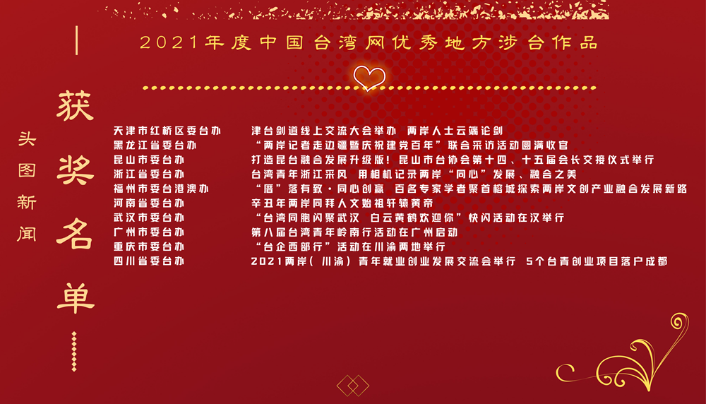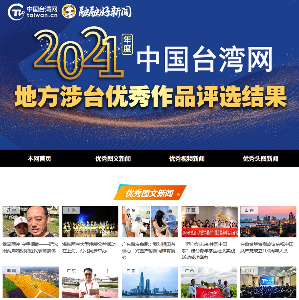 中國臺灣網(wǎng)“2021年度地方涉臺優(yōu)秀作品”揭曉 深化兩岸交流成果匯聚民族復(fù)興力量