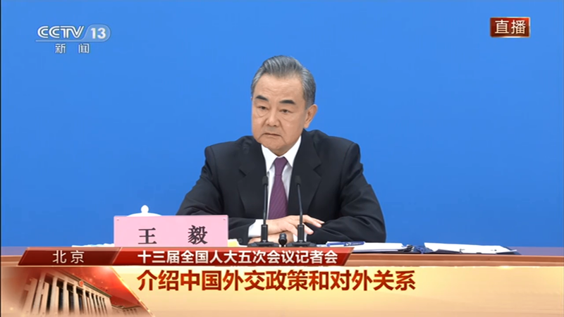 國(guó)務(wù)委員兼外交部長(zhǎng)王毅答中外記者問(wèn)。(圖片來(lái)源:央視畫(huà)面截圖)