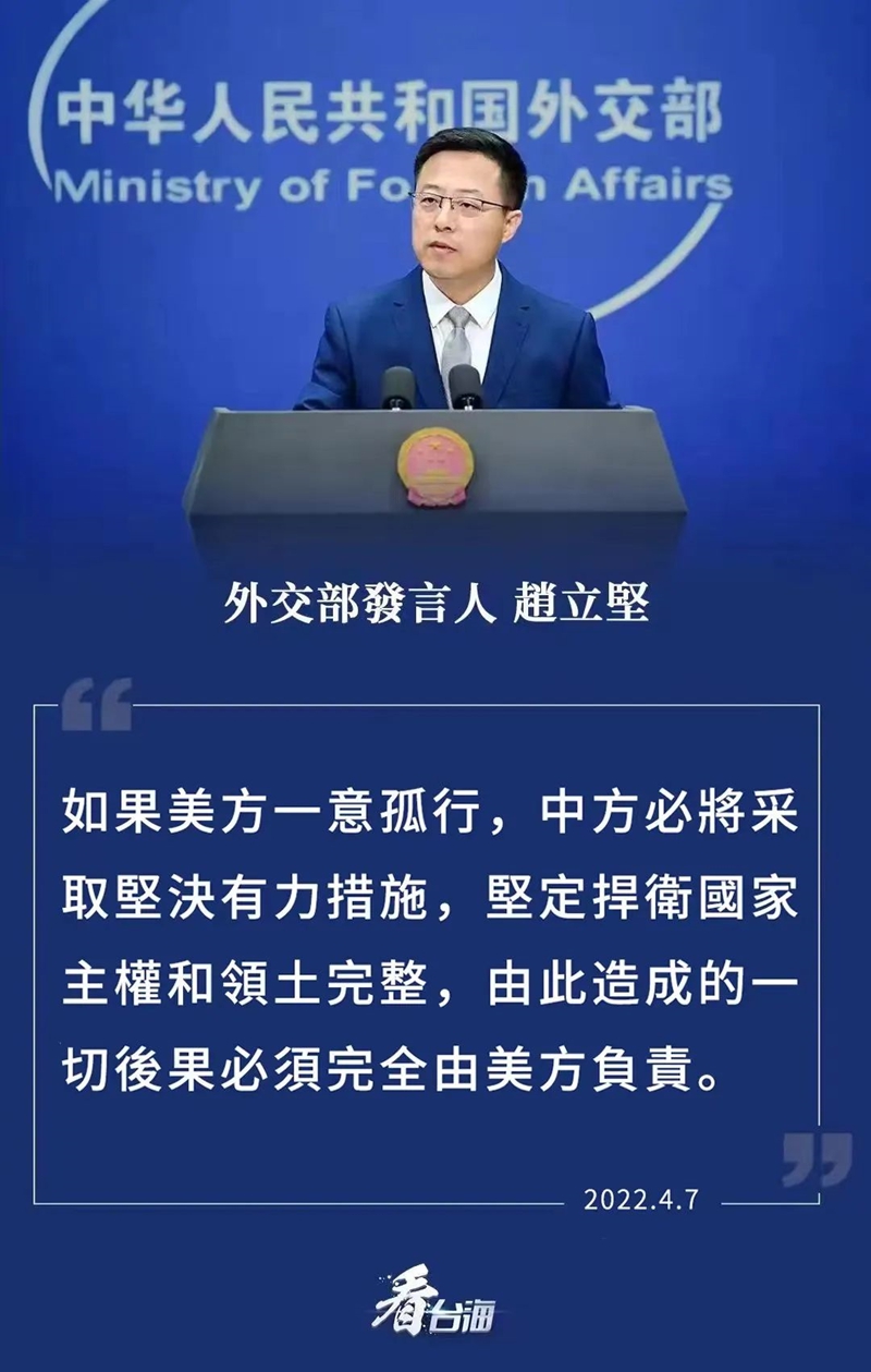 現(xiàn)階段,“遏制中國”已經(jīng)成為一些美國政客的病態(tài)心理。為了對抗中國,這些政客不顧道義、不顧臉面,只要是不利于中國發(fā)展之策,就被他們爭相使用,其中打“臺灣牌”就是他們慣用的伎倆。佩洛西此次策劃竄訪臺灣就是打“臺灣牌”中事態(tài)比較嚴(yán)重的一種,向“臺獨”分裂勢力發(fā)出了嚴(yán)重錯誤信號。但他們顯然打錯了算盤,面對美方的種種挑釁,中方絕不會坐視不管。正如外交部發(fā)言人趙立堅4月7日強(qiáng)調(diào)的,如果美方一意孤行,中方必將采取堅決有力措施,堅定捍衛(wèi)國家主權(quán)和領(lǐng)土完整,由此造成的一切后果必須完全由美方負(fù)責(zé)。