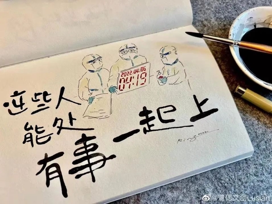 早晨醒來,簡美霜為好友點贊后,拿起畫筆,把這張合照描繪了出來。畫面上,三位“大白”圍在一起,注視著電腦,電腦背面寫著時間,旁邊是幾個字:這些人能處,有事一起上。