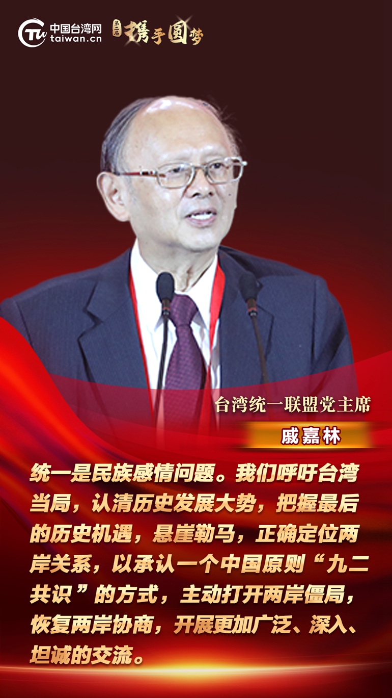 第二屆“攜手圓夢——兩岸同胞交流研討活動”7日在北京開幕。臺灣統(tǒng)一聯(lián)盟黨主席戚嘉林在致辭時指出,統(tǒng)一是民族感情問題。我們呼吁臺灣當(dāng)局,認清歷史發(fā)展大勢,把握最后的歷史機遇,懸崖勒馬,正確定位兩岸關(guān)系,以承認一個中國原則“九二共識”的方式,主動打開兩岸僵局,恢復(fù)兩岸協(xié)商,開展更加廣泛、深入、坦誠的交流。
