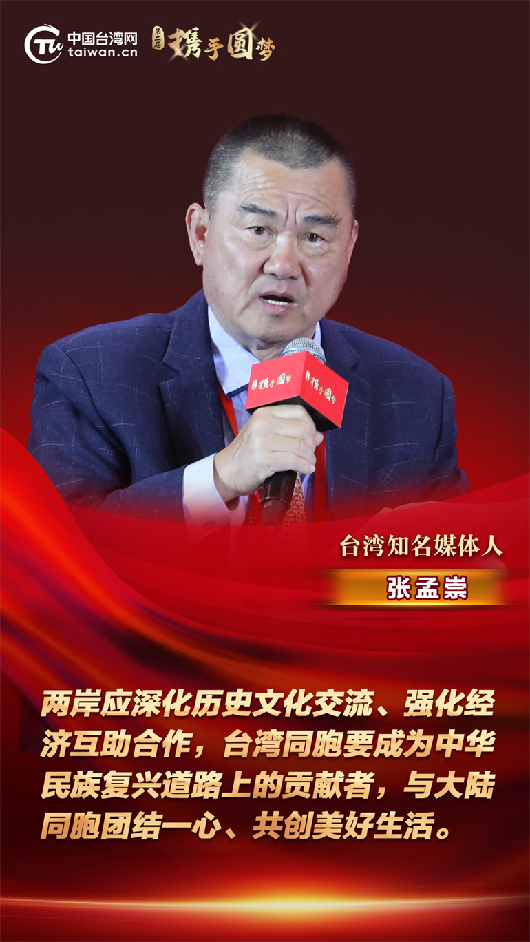 臺灣知名媒體人張孟崇在日前舉辦的第二屆“攜手圓夢——兩岸同胞交流研討活動(dòng)”上表示,兩岸應(yīng)深化歷史文化交流、強(qiáng)化經(jīng)濟(jì)互助合作,臺灣同胞要成為中華民族復(fù)興道路上的貢獻(xiàn)者,與大陸同胞團(tuán)結(jié)一心、共創(chuàng)美好生活。