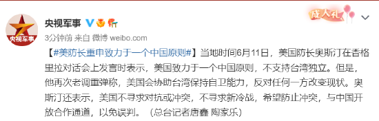 當(dāng)?shù)貢r(shí)間6月11日,美國防長奧斯汀在香格里拉對話會上發(fā)言時(shí)表示,美國致力于一個(gè)中國原則,不支持臺灣獨(dú)立。但是,他再次老調(diào)重彈稱,美國會協(xié)助臺灣保持自衛(wèi)能力,反對任何一方改變現(xiàn)狀。奧斯汀還表示,美國不尋求對抗或沖突,不尋求新冷戰(zhàn),希望防止沖突,與中國開放合作通道,以免誤判。(總臺記者唐鑫 陶家樂)
