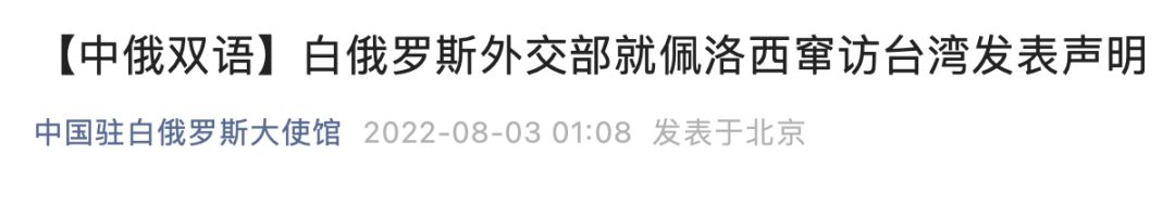 8月2日,白俄羅斯外交部就佩洛西竄訪臺(tái)灣發(fā)表聲明,全文如下: