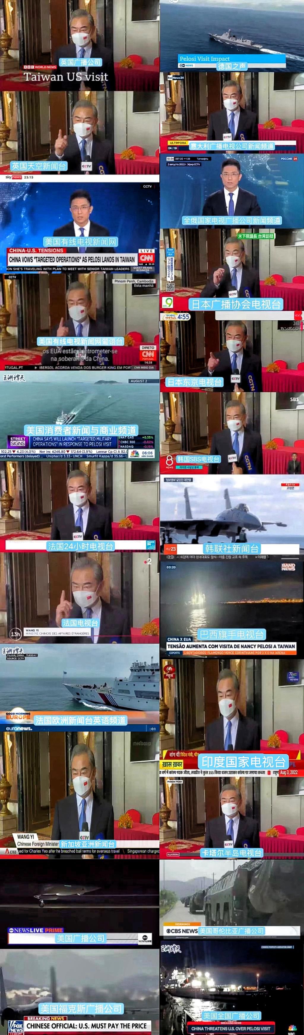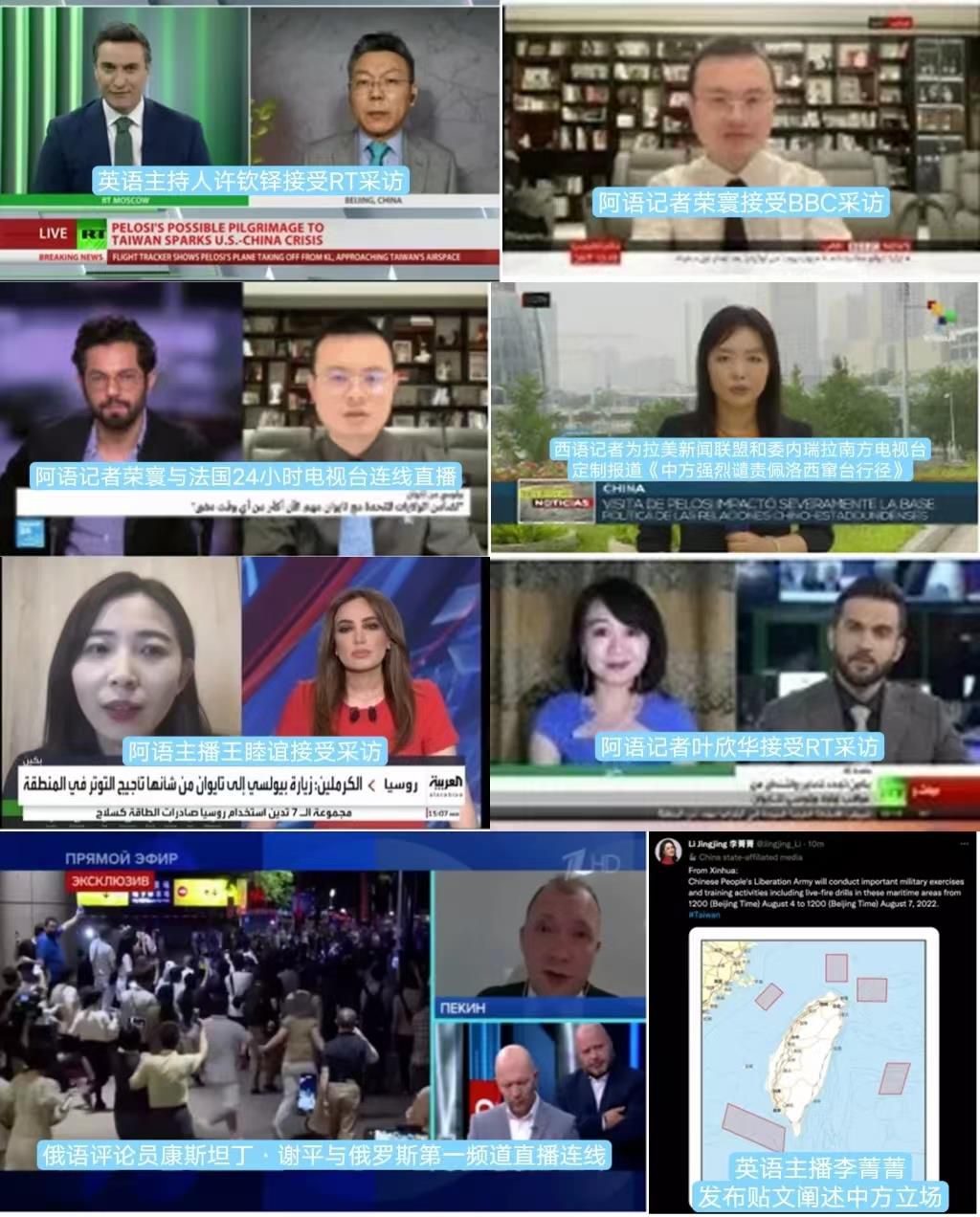 總臺(tái)CGTN英語(yǔ)、西班牙語(yǔ)、法語(yǔ)、阿拉伯語(yǔ)、俄語(yǔ)的多位主播、評(píng)論員等接連與43家國(guó)際主流媒體連線或發(fā)表署名文章,接受了包括今日俄羅斯(RT)、伊朗英語(yǔ)新聞電視臺(tái)(Press TV)、拉美新聞聯(lián)盟、貝寧E-TELE電視臺(tái)、法國(guó)24小時(shí)電視臺(tái)、沙特阿拉比亞電視臺(tái)以及以色列24小時(shí)新聞?lì)l道在內(nèi)的多家國(guó)際媒體的采訪連線,主動(dòng)闡釋中方立場(chǎng),分析佩洛西這一挑釁行徑背后的虛偽動(dòng)因,揭批美國(guó)在臺(tái)灣問(wèn)題上“說(shuō)一套做一套”、侵犯中國(guó)主權(quán)和領(lǐng)土完整的行為。
