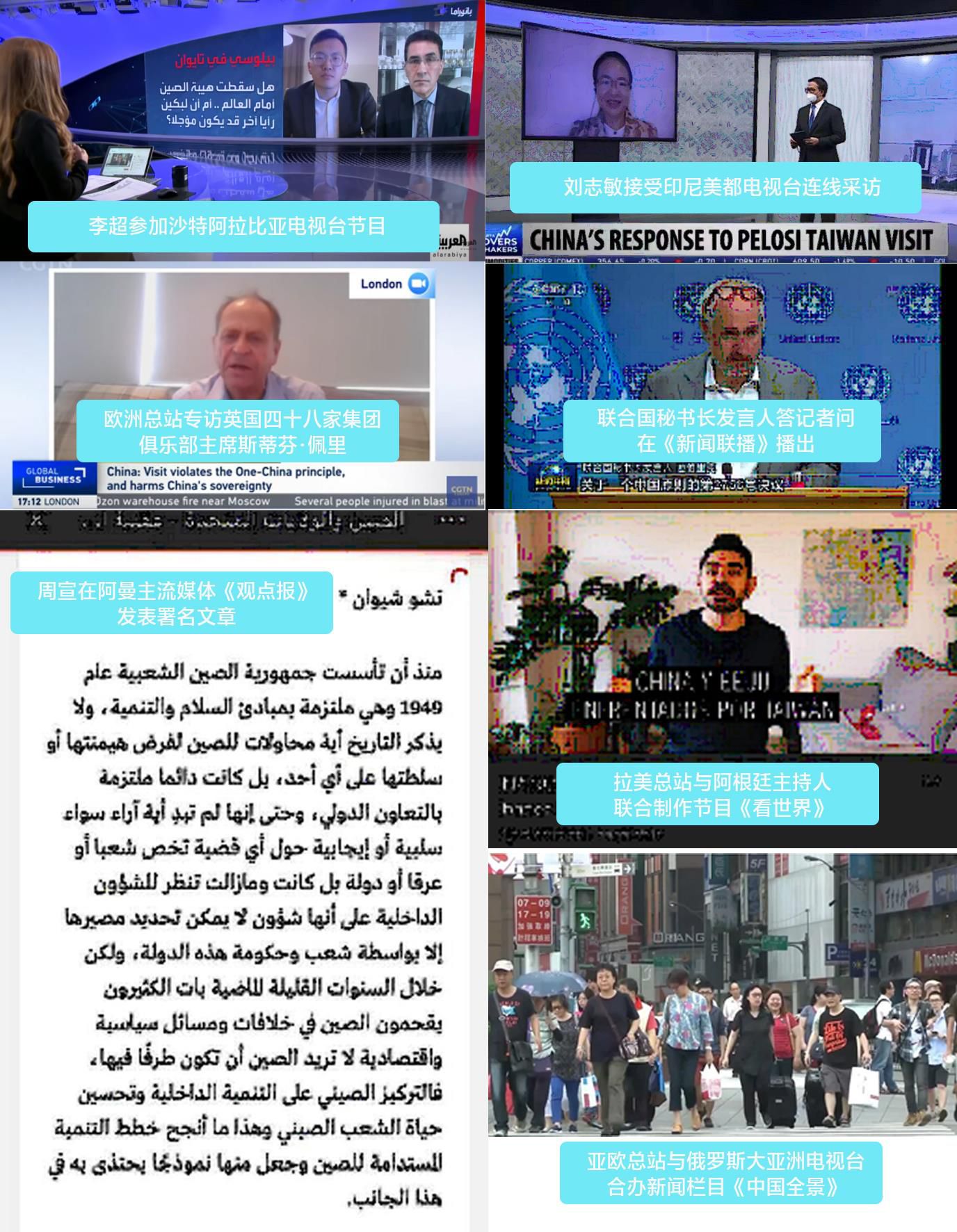 8月2日至4日,中東總站、亞太總站記者參加沙特阿拉比亞電視臺(tái)、沙特東方電視臺(tái)、沙特24電視臺(tái)、英國(guó)天空新聞臺(tái)阿拉伯語(yǔ)頻道、埃及明日電視臺(tái)、以色列24小時(shí)新聞?lì)l道、印尼美都電視臺(tái)等當(dāng)?shù)刂髁髅襟w黃金時(shí)段節(jié)目,表達(dá)中方嚴(yán)正立場(chǎng),詳細(xì)講述臺(tái)灣問(wèn)題的歷史經(jīng)緯。