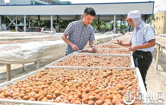 楊棋崴(左)和技術(shù)員在查看晾曬果品的質(zhì)量