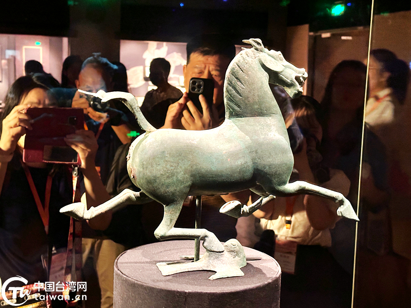 甘肅省博物館鎮(zhèn)館之寶“銅奔馬”(也被稱為“馬踏飛燕”)。圖為媒體在拍照留念。(中國(guó)臺(tái)灣網(wǎng) 李柏濤 攝)