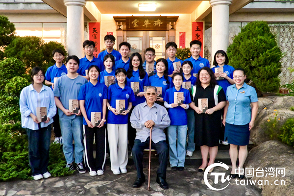 圖為漳州天福茶業(yè)有限公司創(chuàng)始人李瑞河先生為實(shí)踐隊(duì)成員贈(zèng)書并合影留念。(中國(guó)臺(tái)灣網(wǎng)發(fā))