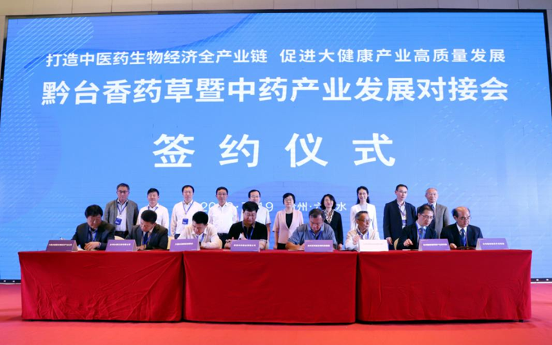 圖為7月19日舉行的“黔臺(tái)香藥草暨中藥產(chǎn)業(yè)發(fā)展對(duì)接會(huì)”簽約儀式現(xiàn)場(chǎng),這是2023年“貴州·臺(tái)灣經(jīng)貿(mào)交流合作懇談會(huì)”系列活動(dòng)之一。