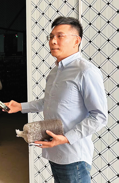 甘肅臺(tái)商錢建華在菌菇大棚旁。