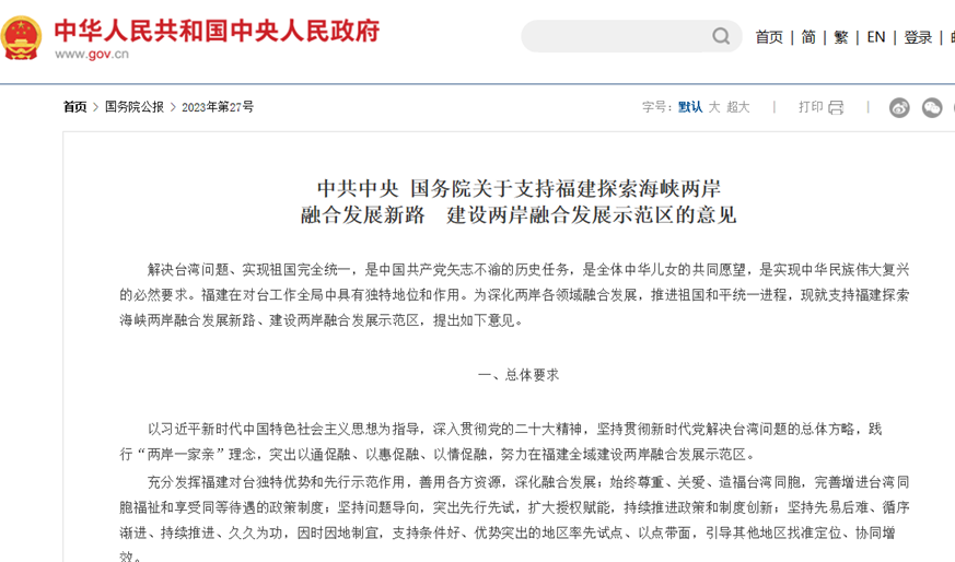 《中共中央 國務(wù)院關(guān)于支持福建探索海峽兩岸融合發(fā)展新路建設(shè)兩岸融合發(fā)展示范區(qū)的意見》發(fā)布實施。