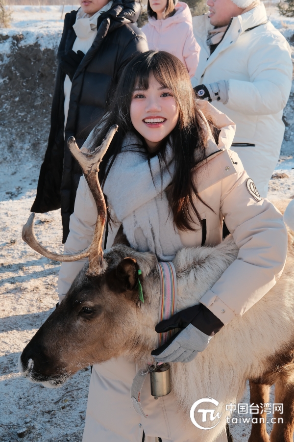 1月26日,2024年全國臺聯(lián)第三十屆臺胞青年冬令營內(nèi)蒙古分營一行人前往敖魯古雅鄂溫克民族鄉(xiāng),陳紀陵與馴鹿合影留念。(臺灣同學 王奕勛 攝)