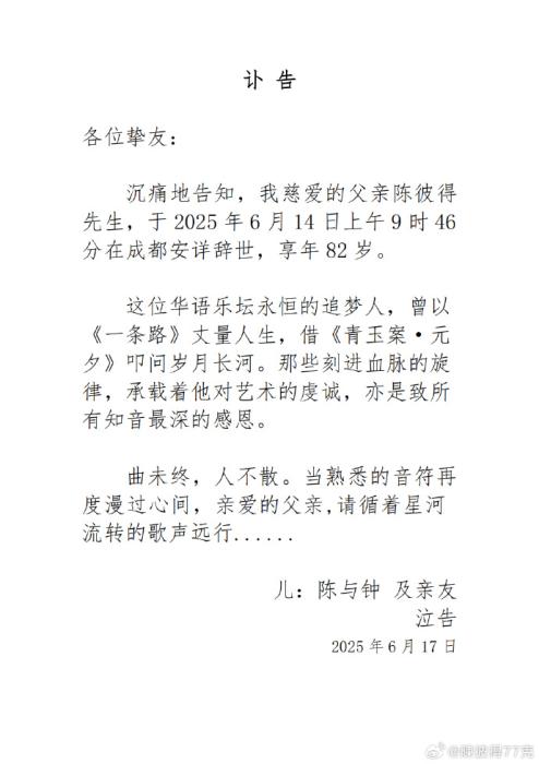 陳彼得家人17日發(fā)布訃告:“這位華語樂壇永恒的追夢人,曾以《一條路》丈量人生,借《青玉案·元夕》叩問歲月長河。那些刻進血脈的旋律,承載著他對藝術(shù)的虔誠,亦是致所有知音最深的感恩。”
