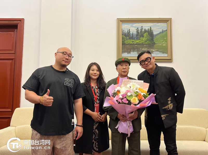 臺(tái)灣青年自媒體人與抗聯(lián)戰(zhàn)士王濟(jì)堂合影。(中國臺(tái)灣網(wǎng)記者 劉琳 攝)