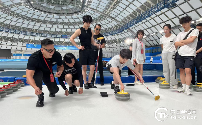 臺(tái)灣青年自媒體博主向運(yùn)動(dòng)員學(xué)習(xí)冰壺發(fā)球姿勢(shì)。(中國臺(tái)灣網(wǎng)記者 劉琳 攝)