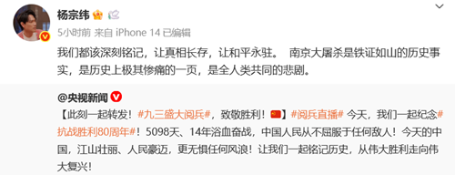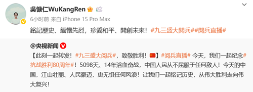 而無懼臺灣陸委會關(guān)于“不要呼應(yīng)大陸所謂‘統(tǒng)戰(zhàn)’宣傳,尤其是九三閱兵”的威脅恐嚇,舒淇、伊能靜、吳奇隆、楊宗緯、文淇、吳慷仁、顏人中等多名臺灣藝人也紛紛在社交平臺轉(zhuǎn)發(fā)央視新聞貼文,表達銘記歷史、紀(jì)念英烈、珍視和平的心聲。(文/文方)