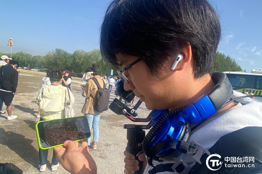 中國臺灣網記者李銳在采訪現(xiàn)場觀看紀念中國人民抗日戰(zhàn)爭暨世界反法西斯戰(zhàn)爭勝利80周年大會直播。(中國臺灣網記者 李寧 攝)