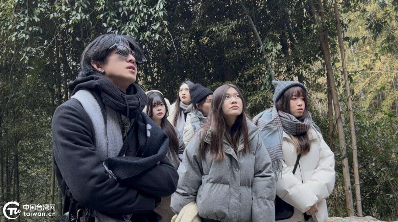 臺灣青年在四明山的白水沖瀑布前,聽誦王陽明詩作《四明觀山水》。(中國臺灣網(wǎng)記者 劉琳 攝)
