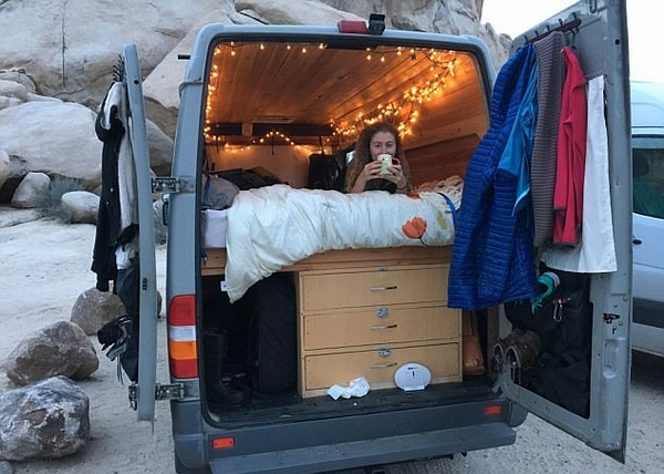 卡婭在自己的車中安裝了木抽屜,并且在車頂裝配上行李架。她十分享受房車旅行的生活,在車?yán)镒鲲?在荒野爬山,并且將這些點(diǎn)滴都在日記中記錄下來!皩(duì)我來說,住在車中就是我的理想生活!笨▼I表示。