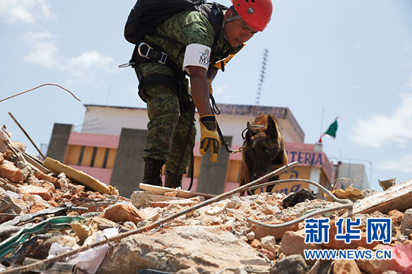 9月9日,在墨西哥瓦哈卡州胡奇坦,搜救人員和搜救犬在房屋廢墟上進(jìn)行搜救。根據(jù)墨西哥政府發(fā)布的最新數(shù)據(jù),截至9日晚,墨西哥地震遇難人數(shù)已上升至90人。墨西哥軍方和國(guó)防部開(kāi)始向受災(zāi)最嚴(yán)重的瓦哈卡州胡奇坦增派救援人員,為當(dāng)?shù)孛癖娞峁┤说涝。新華社記者淡航攝