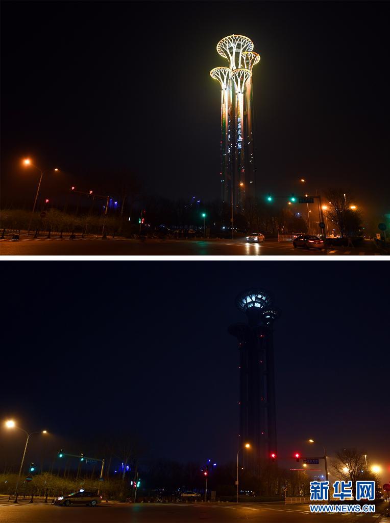 這是一張拼版照片:3月27日拍攝的熄燈前后的北京奧林匹克塔等建筑的對(duì)比。新華社記者 任超 攝