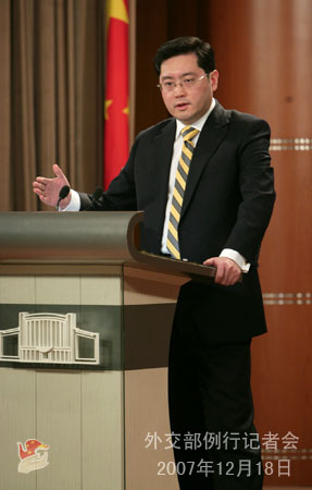2007年12月18日下午,外交部發(fā)言人秦剛舉行例行記者會(huì),就朝鮮半島核問(wèn)題、日本福田首相訪華、普京總統(tǒng)表示愿意出任俄新一屆政府總理、巴厘島氣候變化大會(huì)等回答記者提問(wèn)。
