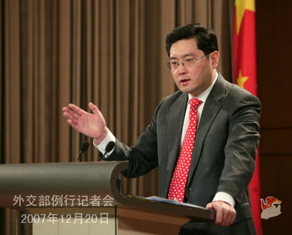 2007年12月20日下午,外交部發(fā)言人秦剛舉行例行記者會,就朝鮮半島核問題、李明博當(dāng)選韓國新一屆總統(tǒng)、日本福田首相訪華、中印聯(lián)合反恐訓(xùn)練、緬甸問題等回答記者提問。