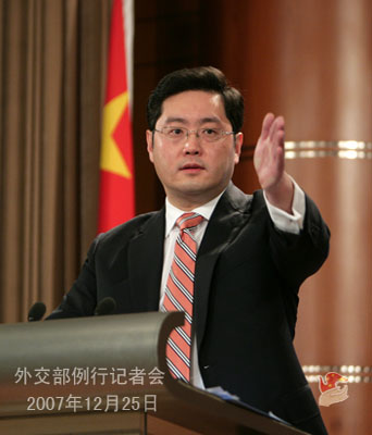 2007年12月25日,外交部發(fā)言人秦剛舉行例行記者會(huì),就日本首相福田訪華及六方會(huì)談等問題答記者問。