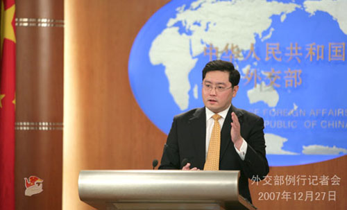 2007年12月27日,外交部發(fā)言人秦剛舉行例行記者會,就日本首相福田訪華及六方會談等問題答記者問。