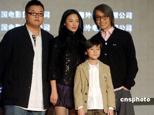 十一月二十二日,周星馳攜張雨綺(左二)、徐嬌(右二)、林子聰(左一)在北京出席其新片《長(zhǎng)江七號(hào)》的發(fā)布會(huì),他接受記者采訪時(shí)坦言這部電影是源自自己從小的一個(gè)夢(mèng)想,并曾真的見過兩次UFO。 中新社發(fā) 廖攀 攝