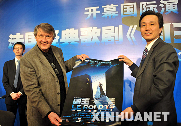 3月24日,米歇爾·普拉松(左二)展示歌劇《國王》的海報(bào)。當(dāng)日,法國經(jīng)典歌劇《國王》法方指揮米歇爾·普拉松與中國媒體見面。由國家大劇院出品、法國圖盧茲市政廳歌劇院制作的《國王》,是國家大劇院開幕演出季的壓軸大戲,將于4月3日至6日在國家大劇院上演。新華社記者羅曉光攝