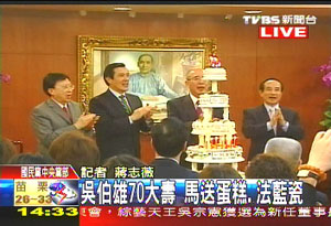 人物:國民黨慶吳伯雄70大壽 馬英九送蛋糕洪秀柱獻(xiàn)吻 |