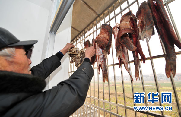 李元庭在新家的樓上晾曬為過年準備的新腌制的臘肉和魚(1月22日攝)。