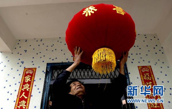 2月2日,老蔡在自家新房前掛紅燈籠。農歷除夕,記者在海南省文昌市文城鎮(zhèn)頭坡村委會江村新村見到61歲的農民蔡文仿的時候,他正在自家新房前掛紅燈籠,臉上洋溢著幸福的笑容。今天,老蔡要和兒孫們在新房里吃團年飯,共度除夕之夜。老蔡的樓房坐北朝南,一樓有兩間房,最大的一間是客廳,老蔡和小兒子一家四口住在二樓!罢媸窍氩坏桨。 崩喜谈锌溃骸昂樗^后,我以為江村完了,根本想不到春節(jié)能在這么好的房子里過。” 2010年10月,文昌市遭遇百年不遇的特大洪澇災害,128個自然村18.6萬人受災。10月8日凌晨,赤紙水庫決堤,江村變成一片汪洋,百余間房屋被洪水瞬間沖倒,昔日的村莊一片狼藉。老蔡家的4間磚瓦房也只剩下一片瓦礫。洪水退去后,江村整村異地重建由海南現代科技集團有限公司、香港椰林閣集團資助600萬元、文昌市政府出資300多萬元共同完成。新村占地33畝,前后4排,共5幢36套房。每棟“小洋樓”分為上下兩層,居住面積115平方米。春節(jié)后,江村還將配套建設太陽能、沼氣池、衛(wèi)生室、文化廣場(球場)等社區(qū)公共設施。新華社記者 侯建森 攝