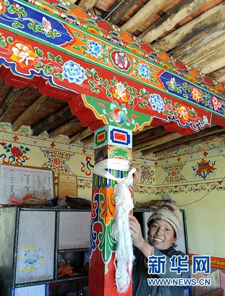 2月9日,西藏堆龍德慶縣古榮鄉(xiāng)農民巴桑卓瑪給自家新房柱子系上象征吉祥的哈達。