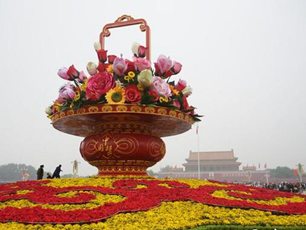 天安門國慶花壇吊裝完成 “祝福祖國”盛開