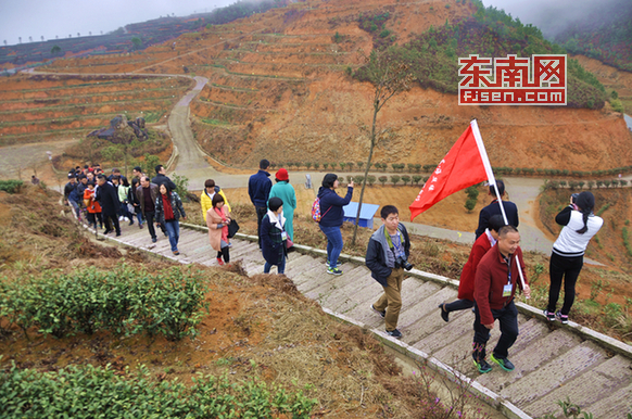 圖為采訪(fǎng)團(tuán)一行走進(jìn)張?zhí)旄I鷳B(tài)茶場(chǎng)。葉伏國(guó) 攝