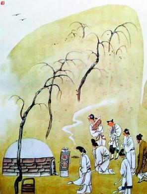 清明掃墓,謂之對祖先的“思時之敬”。其習俗由來已久。明《帝京景物略》載:“三月清明日,男女掃墓,擔提尊榼,轎馬后掛楮錠,粲粲然滿道也。拜者、酹者、哭者、為墓除草添土者,焚楮錠次,以紙錢置墳頭。望中無紙錢,則孤墳矣。哭罷,不歸也,趨芳樹,擇園圃,列坐盡醉!逼鋵,掃墓在秦以前就有了,但不一定是在清明之際,清明掃墓則是秦以后的事。到唐朝才開始盛行。《清通禮》云:“歲,寒食及霜降節(jié),拜掃壙塋,屆期素服詣墓,具酒饌及芟剪草木之器,周胝封樹,剪除荊草,故稱掃墓!辈⑾鄠髦两!