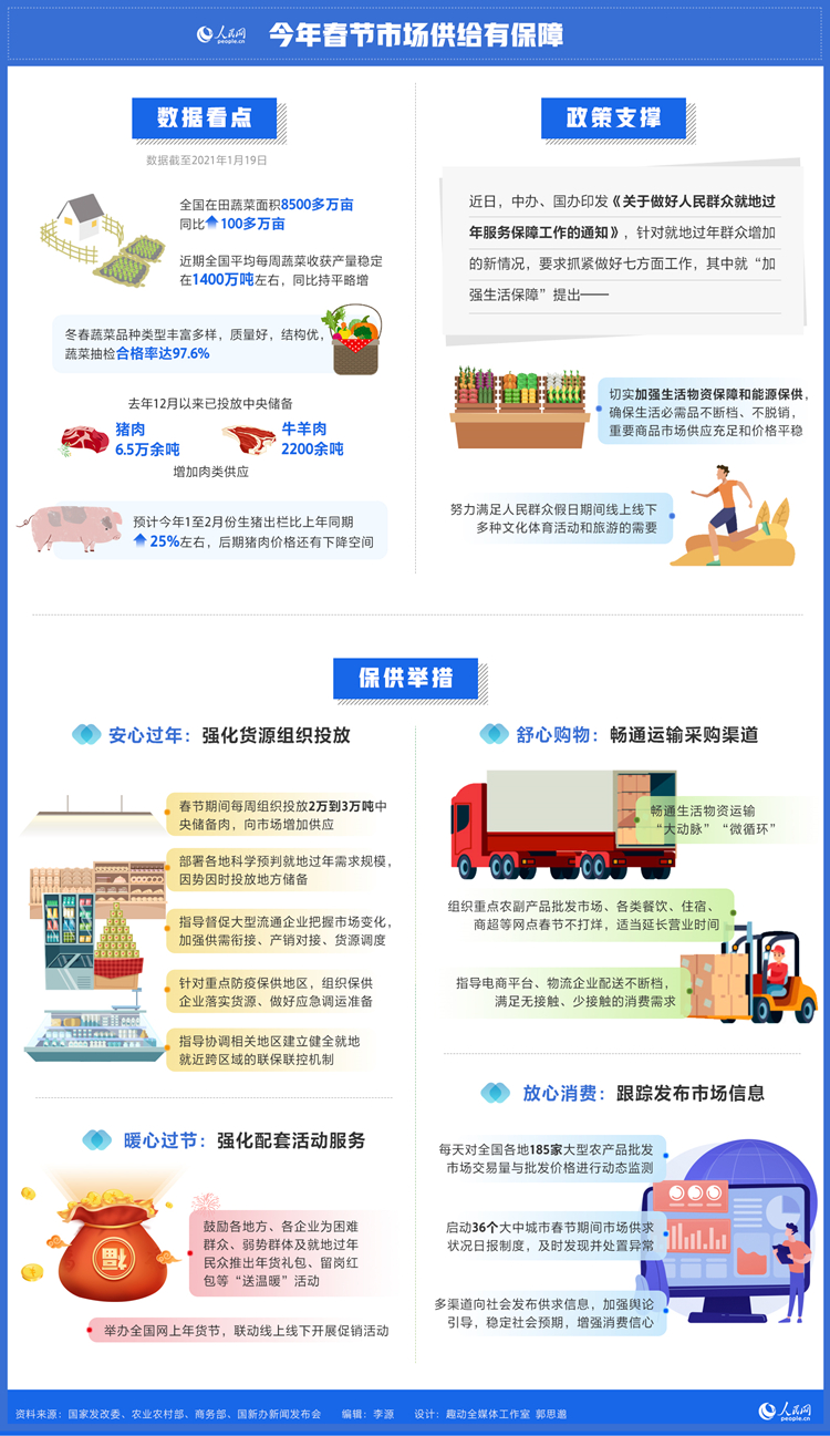 春節(jié)回家團(tuán)圓,對(duì)國(guó)人來(lái)說(shuō)是習(xí)俗更是情結(jié)。不過(guò),在當(dāng)前疫情防控形勢(shì)依然嚴(yán)峻復(fù)雜的情況下,也有越來(lái)越多的人選擇“就地過(guò)年”。大家的選擇更多樣了,需求更多元了,春節(jié)消費(fèi)市場(chǎng)的保供工作怎么做?“米袋子”“菜籃子”是否充裕?煤電油氣供應(yīng)如何?供貨渠道是否暢通?