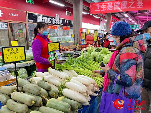 “賣啥的都有,不缺貨,物價(jià)也還可以,春節(jié)不打算專門(mén)囤菜!痹诒本┦谐(yáng)區(qū)大黃莊便民市場(chǎng),董大媽熟練地掃碼、測(cè)溫,趕早進(jìn)入市場(chǎng),挑選了新鮮的白菜、蘿卜、黃瓜、草莓、橘子,花了43.6元。