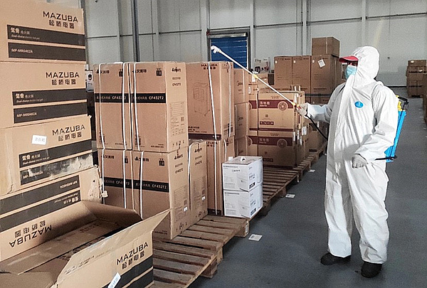蘇寧物流工作人員正在對(duì)倉(cāng)儲(chǔ)場(chǎng)所進(jìn)行消毒。蘇寧易購(gòu)供圖