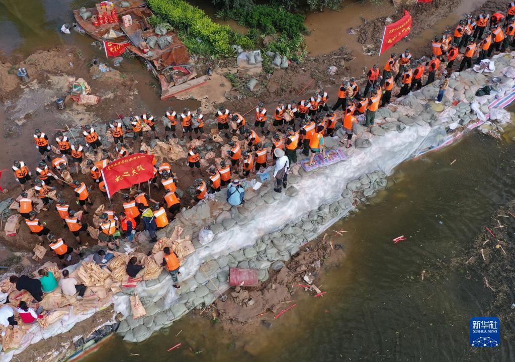 救援人員在河南省鶴壁市?h傅莊堤上搬運沙袋,加固大堤(7月29日攝,無人機(jī)照片)。新華社記者 李安 攝