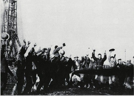 1959年,黑龍江大慶油田工人歡呼第一口油井試噴成功
