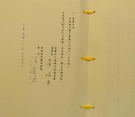 在當(dāng)晚的歡迎宴會上,海協(xié)會會長汪道涵在宴請菜單上寫道:“佳肴佳會,手足之情”。;鶗䲡L辜振甫則在同一張菜單上回應(yīng):“但知春意發(fā),誰識歲寒心”。