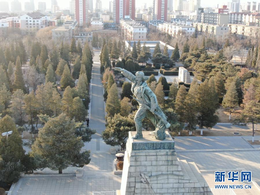 2月2日拍攝的遼沈戰(zhàn)役烈士紀念塔上的英烈銅像(無人機照片)。新華社記者 楊青 攝